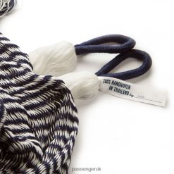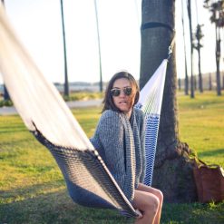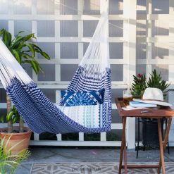 No two Yellow Leaf Hammocks are the same. Handmade and signed by its weaver, each hammock has its own unique pattern and color sequence. Vineyard Haven pairs Navy Blue with Bright White for a classic look.