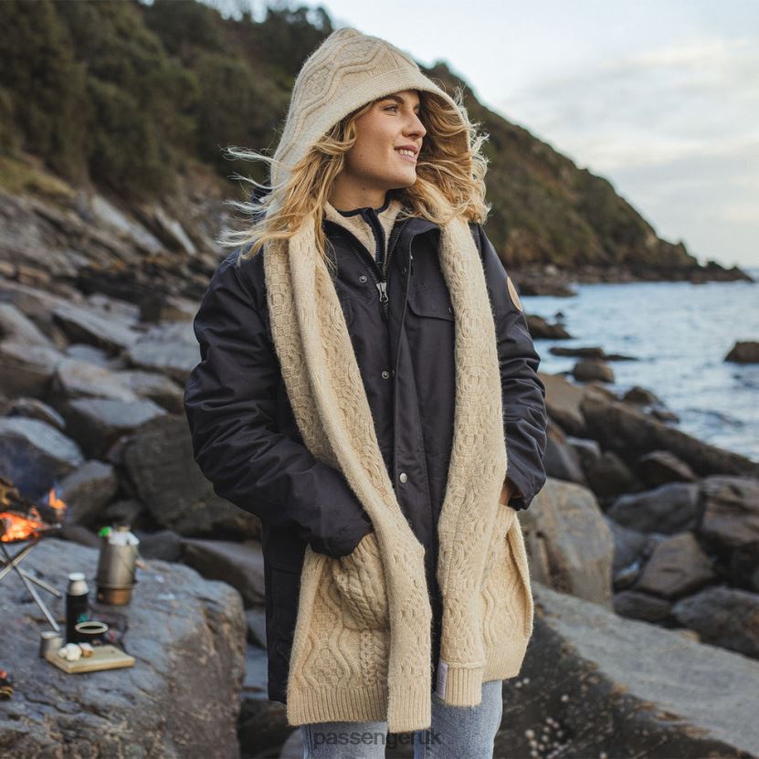 - Mid-weight hooded scarf with a cable knit pattern.